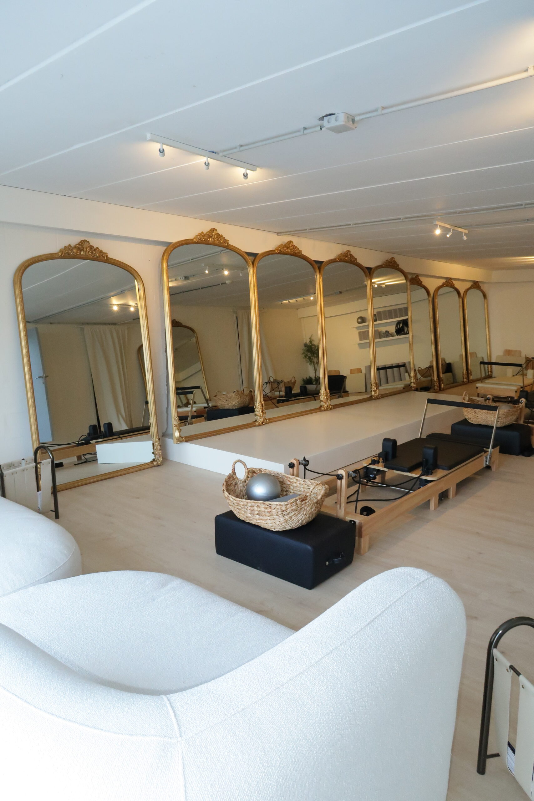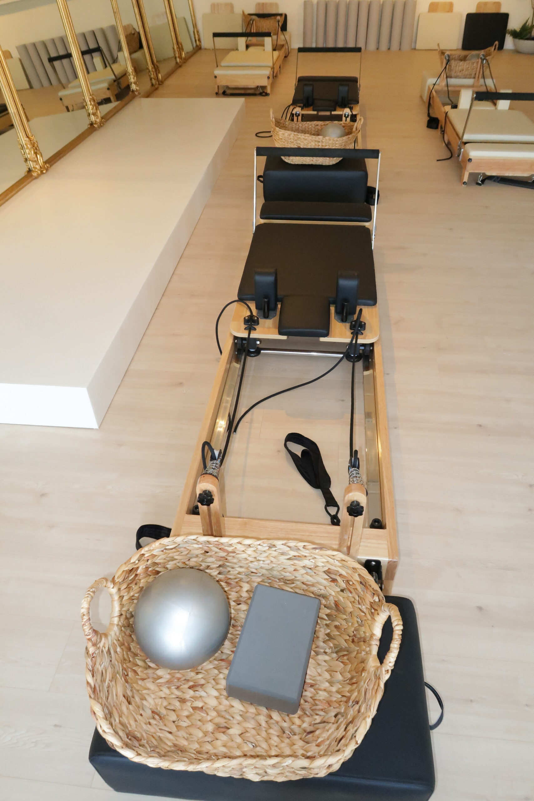 Un aperçu de l’atmosphère du studio : lumière douce, lignes épurées, machines Reformer et tapis soigneusement alignés.